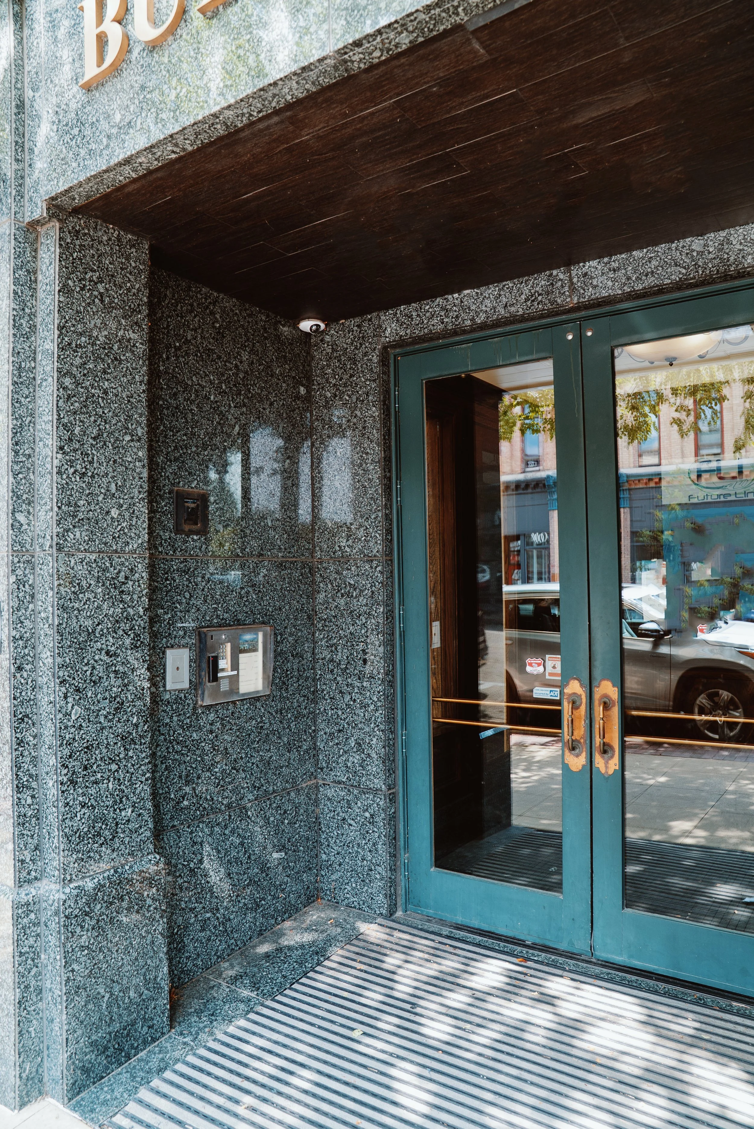 Entrance to the building requires dialing a code on the dialpad to the left of the front doors.