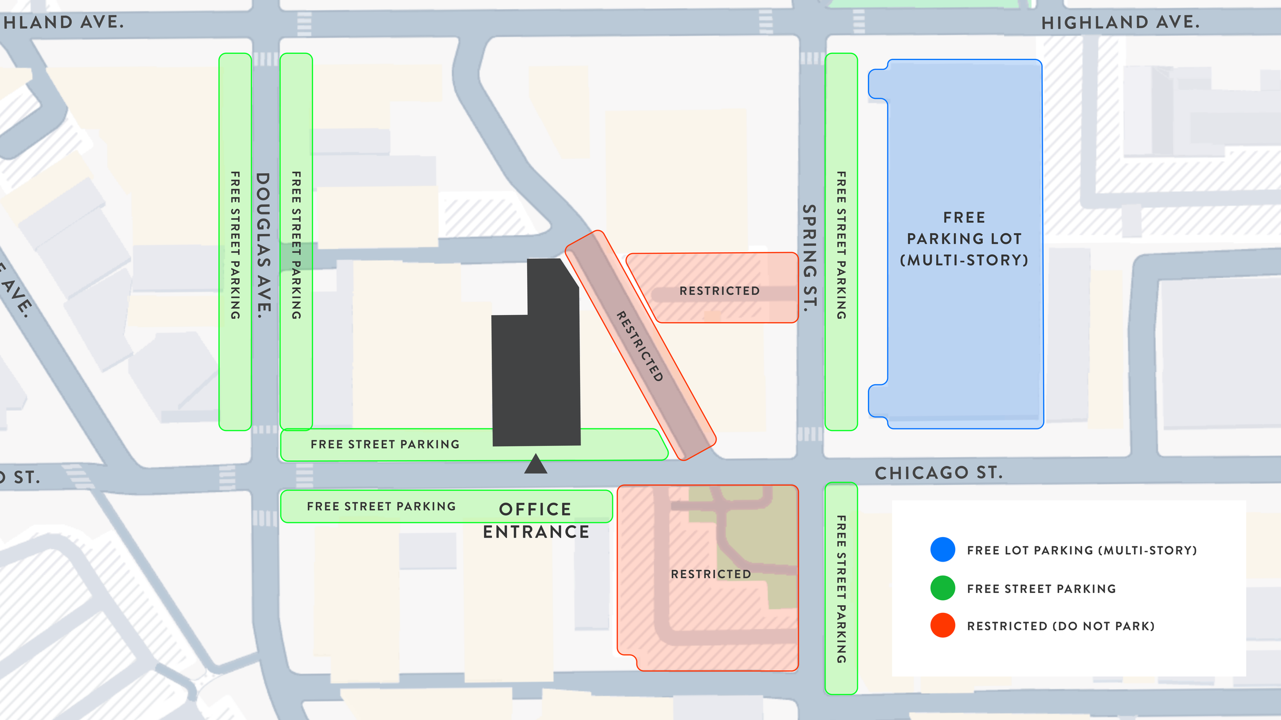 The best place to park is in Elgin’s “Free Parking” lot directly South of our office. There are a couple street parking spots, but generally they fill quickly. There is also a single handicap parking spot directly in front of our entrance for accessibility.